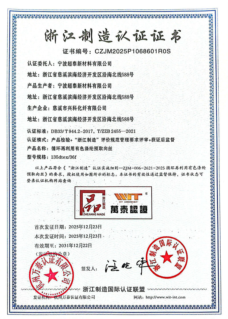 Recently, Ningbo Chaotai New Materials Co., Ltd. has been officially certified under the “Zhejiang Manufacturing” standard and awarded the Pinzi Mark certificate. This certification is conducted in accordance with Zhejiang provincial and group standards, and carried out by qualified third-party certification bodies. It covers multiple aspects including product technology, quality management, green production, and service systems.![]() Established in 2019 as a subsidiary of Cixi Xingke Chemical Fiber Co., Ltd., Chaotai New Materials focuses on the research, development, and production of recycled eco-friendly polyester filament yarns. The company is equipped with automated production facilities and has established a comprehensive quality management system. Its products comply with relevant national and industry standards and have been supplied to multiple domestic and international apparel brands, including ZARA, meeting their requirements for sustainable fiber materials. The “Zhejiang Manufacturing” Pinzi Mark is a regional public brand promoted by Zhejiang Province to support high-quality development in the manufacturing sector. Certification under this program reflects a company’s commitment to high standards, rigorous processes, and sustainable practices. Achieving this certification demonstrates Chaotai New Materials’ ongoing efforts and achievements in standardized production, resource recycling, and consistent product quality. The company adheres to the principle of “resource recycling and green development,” aiming to enhance the quality of recycled fibers through technological innovation and promote circular utilization in the textile industry. Moving forward, Chaotai New Materials will continue to operate in compliance with applicable laws, regulations, and standards, strengthen its end-to-end management processes, deliver products that meet environmental and quality requirements, and fulfill its corporate social responsibilities. |